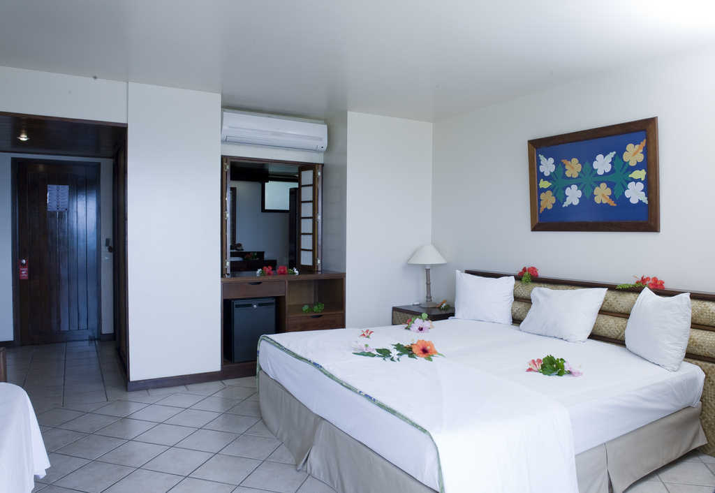 Les chambres Jardin du Maitai Polynesia Bora Bora sont équipées de deux lits simples, pouvant être rapprochés pour former un grand lit, joliment décorés de fleurs fraîches à votre arrivée.