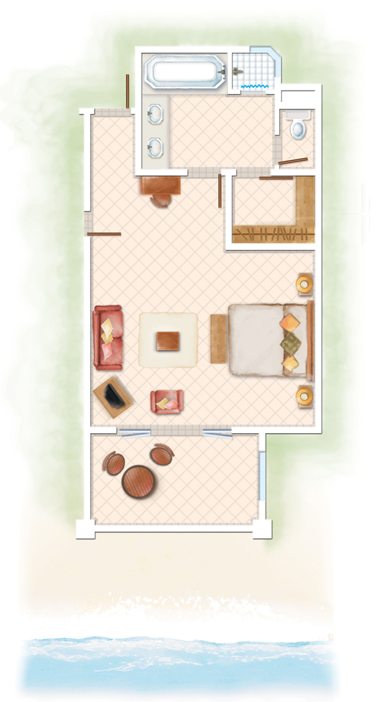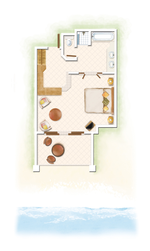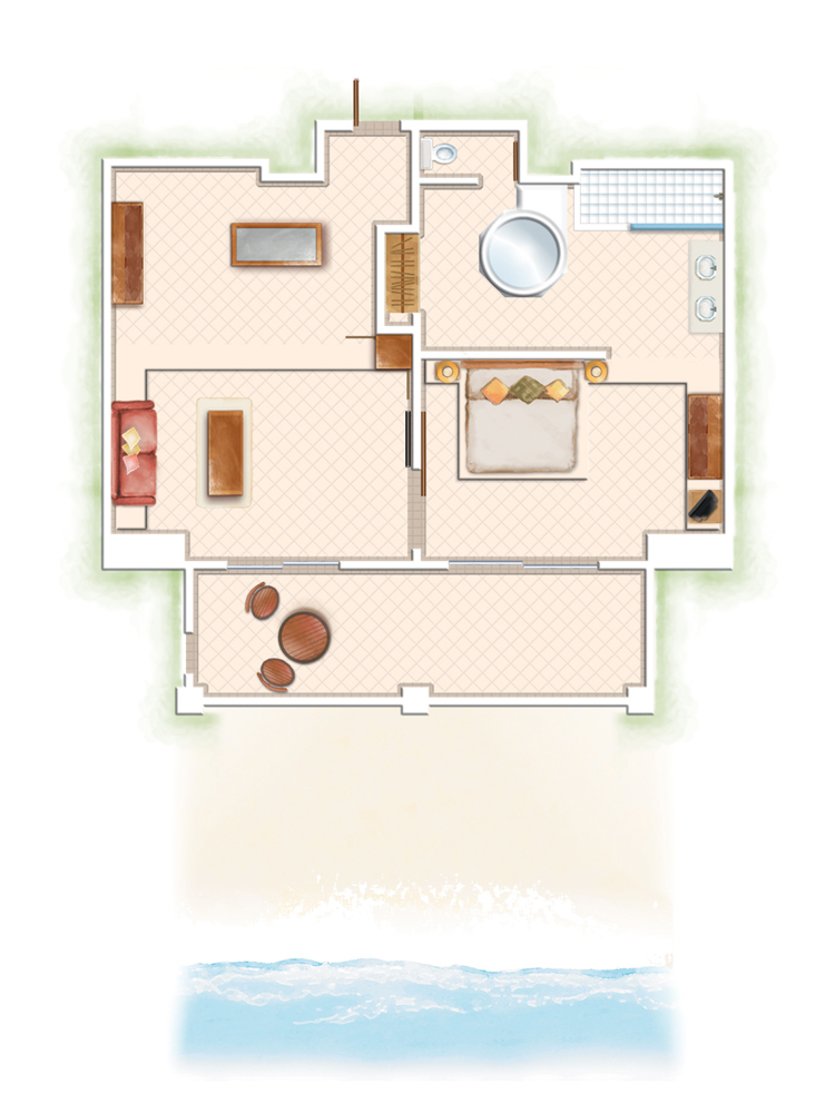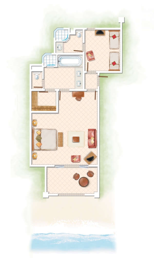 2 ‘Senior Suites’ (110 m²) avec salon séparé, chambre et salle de bains sur 2 niveaux, terrasse avec accès direct à la plage et 2 ‘Family Suites’ (206 m²) sur 2 niveaux dont un réservé aux enfants, 2 chambres, 2 salles de bains avec baignoire ronde pour deux, salon donnant sur la plage. Les suites disposent de lecteur DvD et machine Nespresso.