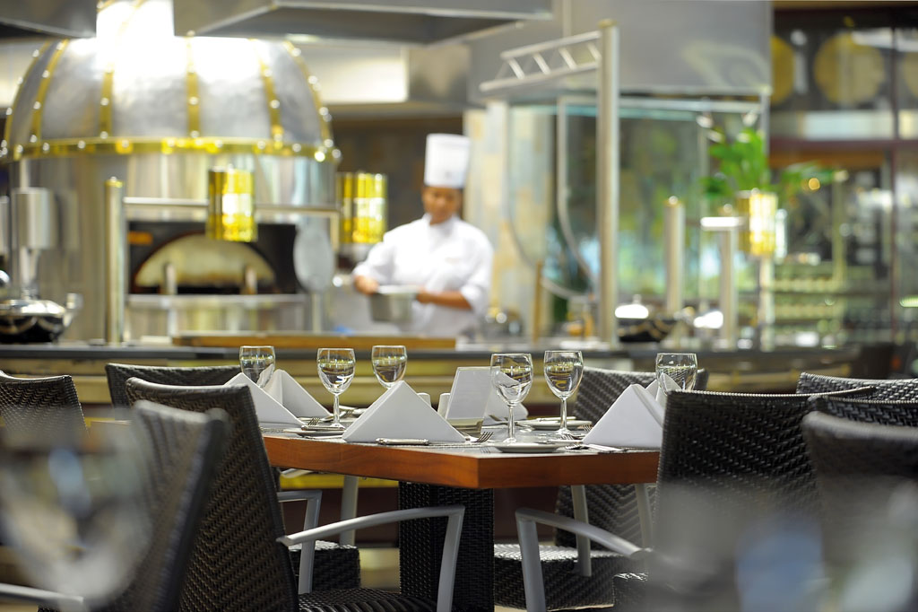 ‘Le Grand Port’, restaurant principal face au lagon, buffets internationaux au petit déjeuner, déjeuner et dîner.