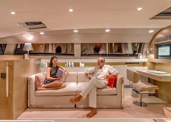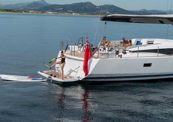 On deck, the cockpit table drops and opens up a vast sundeck; the awnings and canopies are camouflaged in the roof; the annexe is tucked away in the rear skirt in 5 minutes, and opens up a beautiful bathing platform with a high level, secure pool ladder. Circulation from one end of the boat to the other is easy as the deck is uncluttered with large open spaces.