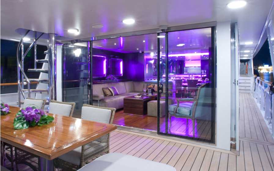 The fixed sunroof covers almost the whole upper deck, which can also easily be enclosed. There are 4 large sofas; wide enough even for sunbathing and 4 dining tables that can be lowered and folded to become smaller cocktail tables.