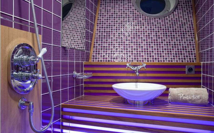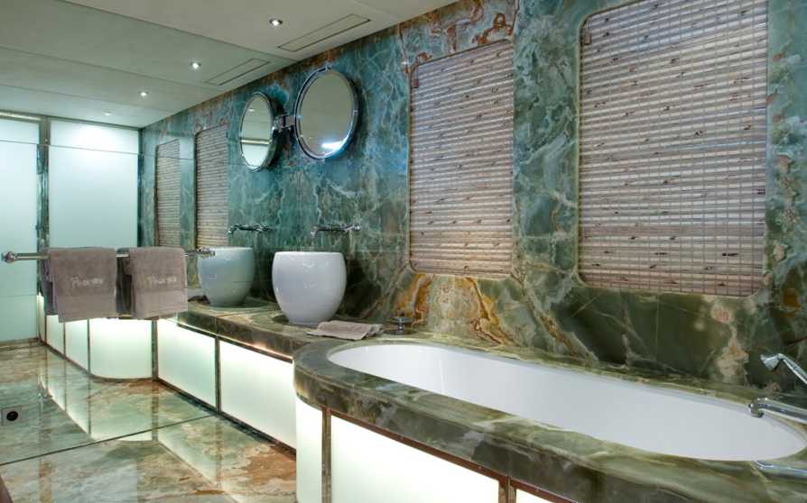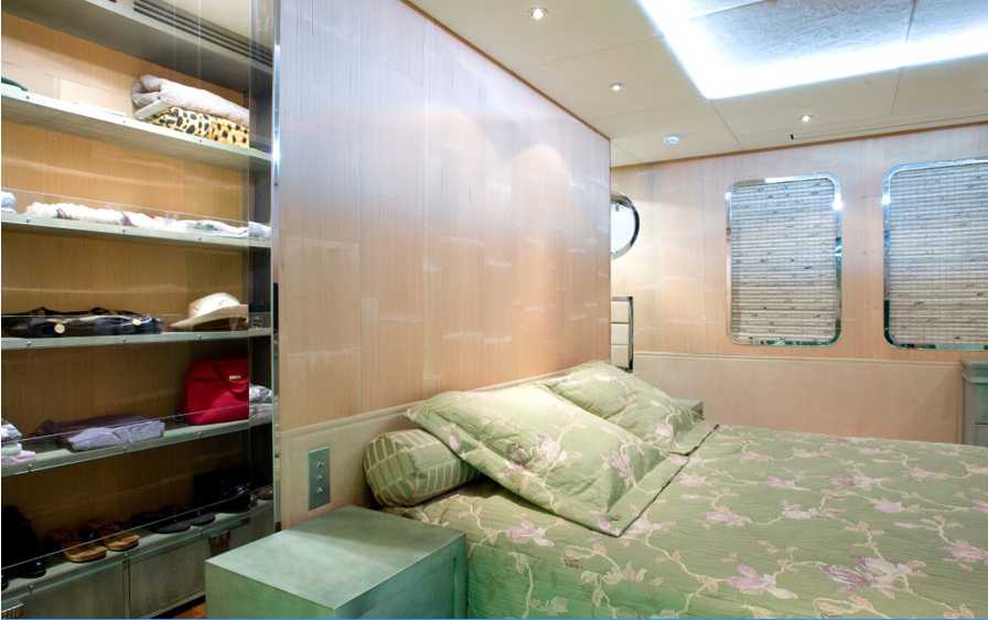 Her master cabin is beautifully decorated in a fusion of Eastern and Western influences. The walls are covered with real bamboo and alcantara on the ceiling. The light green bed spread of the 1.80 m wide double bed matches well the green onyx been used for the walls and the floor of the sink area. The master cabin is very wide and this impression is even underlined by the large windows in this cabin. The toilet and the shower are separated by a door.