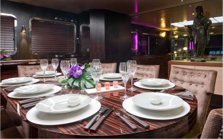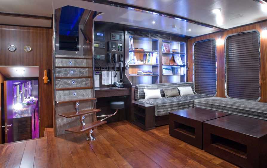 PAOLYRE features an open layout; the interior is furnished with wooden floor, brown velvet upholstery for the salon area, equipped with SAT flat screen TV and Bose Hi-If system and divided from the dining area by a large glass door. The dining table seats 8 guests comfortably. The glass separation protects the salon area from noise. The interior finish is a mixture of different dark woods, warm velvet upholstery and cool stainless steel.