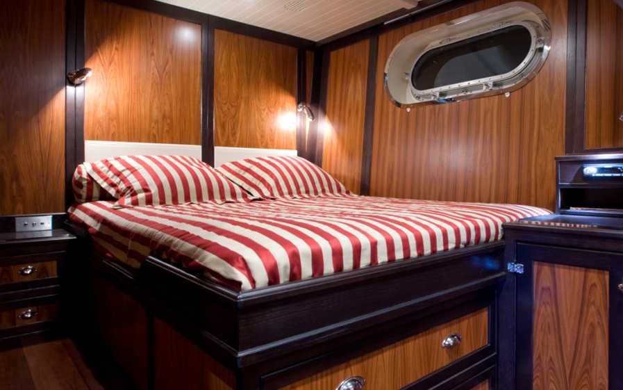 Two double guest cabins have a wooden finish and the decoration is more traditional (one bed 1,60 m wide, the other one 1,40 m wide). Both cabins have a bathroom with en suite shower with marble finish.