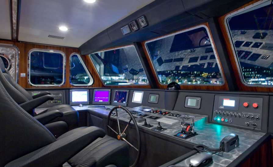 Her wheelhouse is very large and includes a panoramic lounge area flanked by three full height windows on both sides. The location plus the windows of this salon will allow to fully enjoying the navigation while comfortably seated inside.