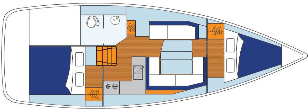 Idéal pour une petite famille ou deux couples, le Sunsail 38 représente l'équilibre parfait entre performances et manœuvrabilité grâce à un plan de voilure et des lignes d'eau qui permettent de naviguer en puissance même par petit temps.