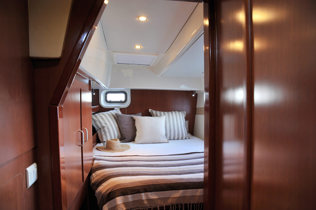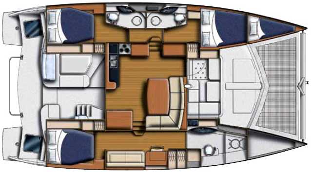 Petit frère du Sunsail 444, le Sunsail 443 est un nouveau catamaran révolutionnaire alliant confort, espace et performances sous voiles. La caractéristique la plus remarquable du 443 est son cockpit avant bien abrité auquel on peut accéder directement depuis le carré, créant ainsi un espace supplémentaire pour vous détendre ou bavarder tout en laissant l’air frais pénétrer dans le carré. Les 3 grandes cabines, chacune avec sa salle de bains privative et ses toilettes ainsi que l’aménagement général du bateau procurent tout l’espace nécessaire pour préserver votre intimité à bord du Sunsail 443. Les 2 jupes arrière, facilement accessibles, constituent deux belles plates-formes de bains. Les bossoirs électriques rendent l’utilisation de l’annexe très facile.  La navigation à bord du Sunsail 443 est différente de celle à bord des autres catamarans ; en effet, avec ses coques à redans étroites et profondes et un faible tirant d'eau, il remonte aussi bien au près que de nombreux monocoques. Et non seulement il remonte très bien au vent, mais il est également très stable au portant, ce qui facilite grandement la vie à bord. Avec une visibilité sur 360 °,  le poste de barre permet de contrôler toutes les manœuvres ; l’équipement électronique est complet et comprend même l’air conditionné. Le 443 est également doté de panneaux solaires pour seconder les batteries.