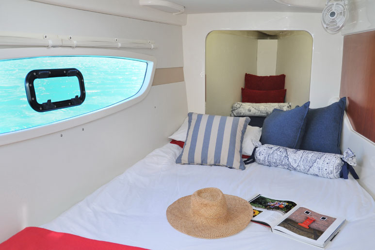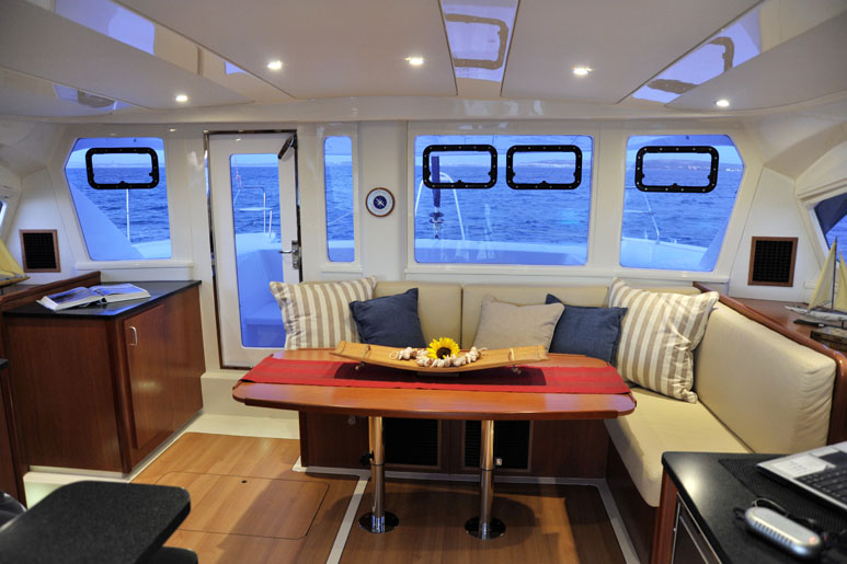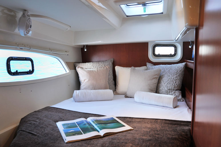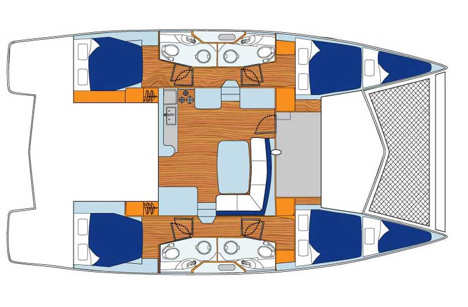 Le 444 offre quatre grandes cabines doubles, avec salle d'eau privative, ainsi qu’une couchette simple dans chaque pointe avant, permettant de vivre jusqu’à 10 personnes à bord dans des conditions optimales de confort. La circulation est aisée dans l'espace carré / cuisine intelligemment agencé et donnant beaucoup de place pour des groupes ou des familles... À l'avant du carré qui abrite le coin repas et le salon, le grand hublot vertical offre une visibilité panoramique laissant pénétrer la lumière en abondance.