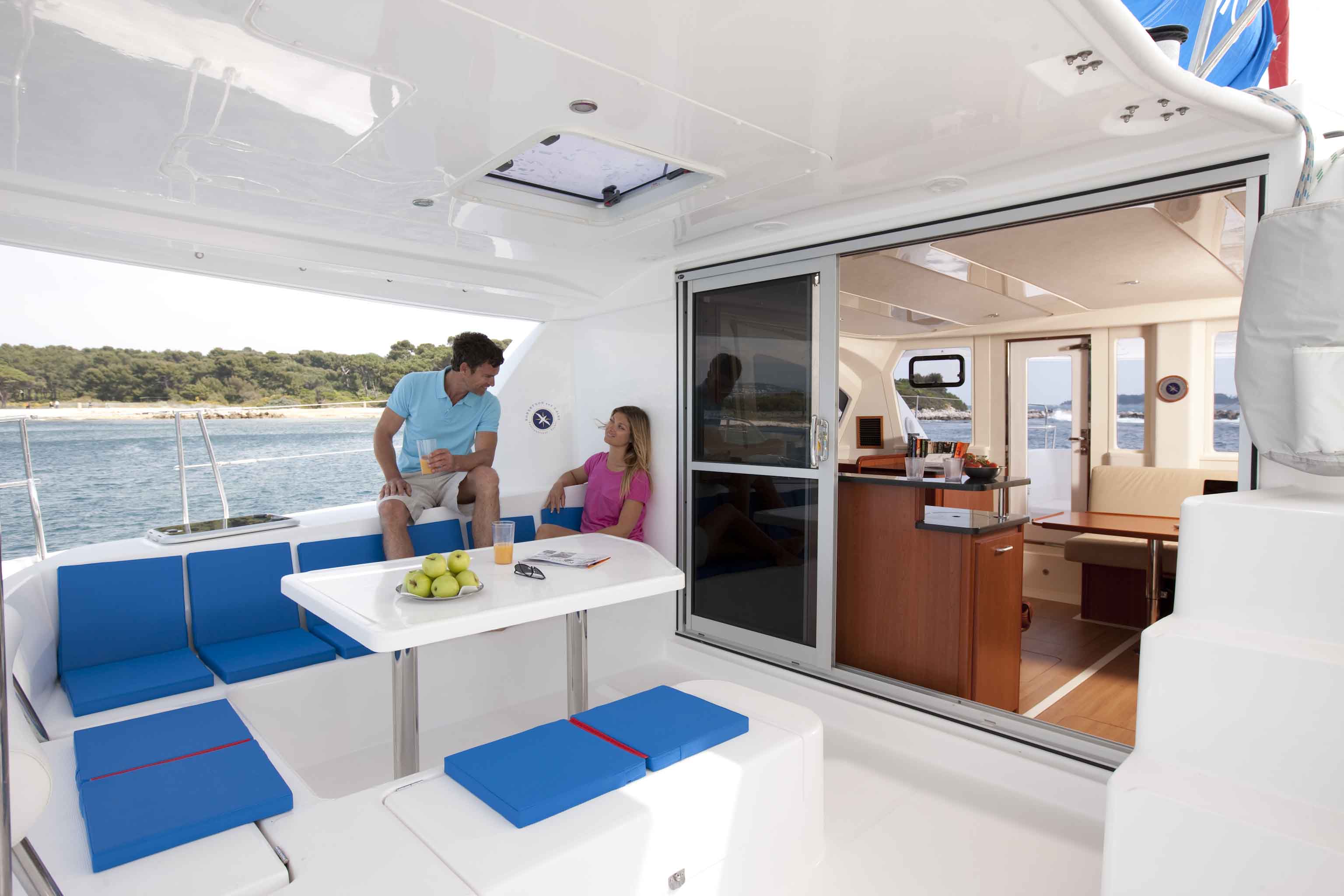L'extérieur du 444 comprend un cockpit ergonomique facilitant la circulation, bien protégé par un bimini rigide. Ses jupes au design « motoryacht » permettent de faciliter l’embarquement et l’accès à l’eau. Les considérations environnementales ont été également au centre de la conception, avec des panneaux solaires installés sur le toit rigide pour charger les batteries. Pour toujours plus de confort, le Sunsail 444 est équipé de générateur, climatisation et toilettes électriques.