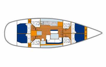 Il est équipé d’un gréement de proportions modestes avec un génois à faible recouvrement afin d’améliorer la puissance au près. Le cockpit avec double barre à roue est très spacieux et comprend une grande table repliable et des panneaux ouvrant assurant luminosité et aération aux cabines arrière.