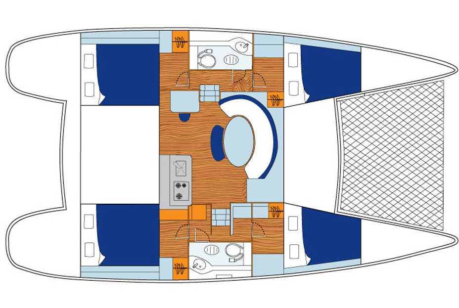 Avec ses 4 cabines, ainsi qu’un cabinet de toilette avec une douche dans chaque coque, le Lagoon 380 est suffisamment spacieux pour accueillir confortablement jusqu’à 8 personnes.