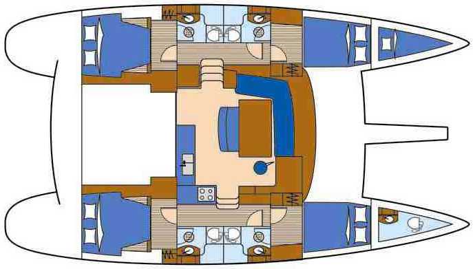 Ce catamaran au design révolutionnaire, dispose de trois grands espaces à vivre extérieurs où vous pourrez confortablement vous détendre. Votre skipper et l’équipage pourront manœuvrer le bateau du haut du poste de barre surélevé sur fly-bridge. Les autres membres de l’équipage pourront choisir de rejoindre le barreur dans le cockpit pour profiter de la navigation, se détendre ou faire une sieste sur le trampoline entre les étraves.